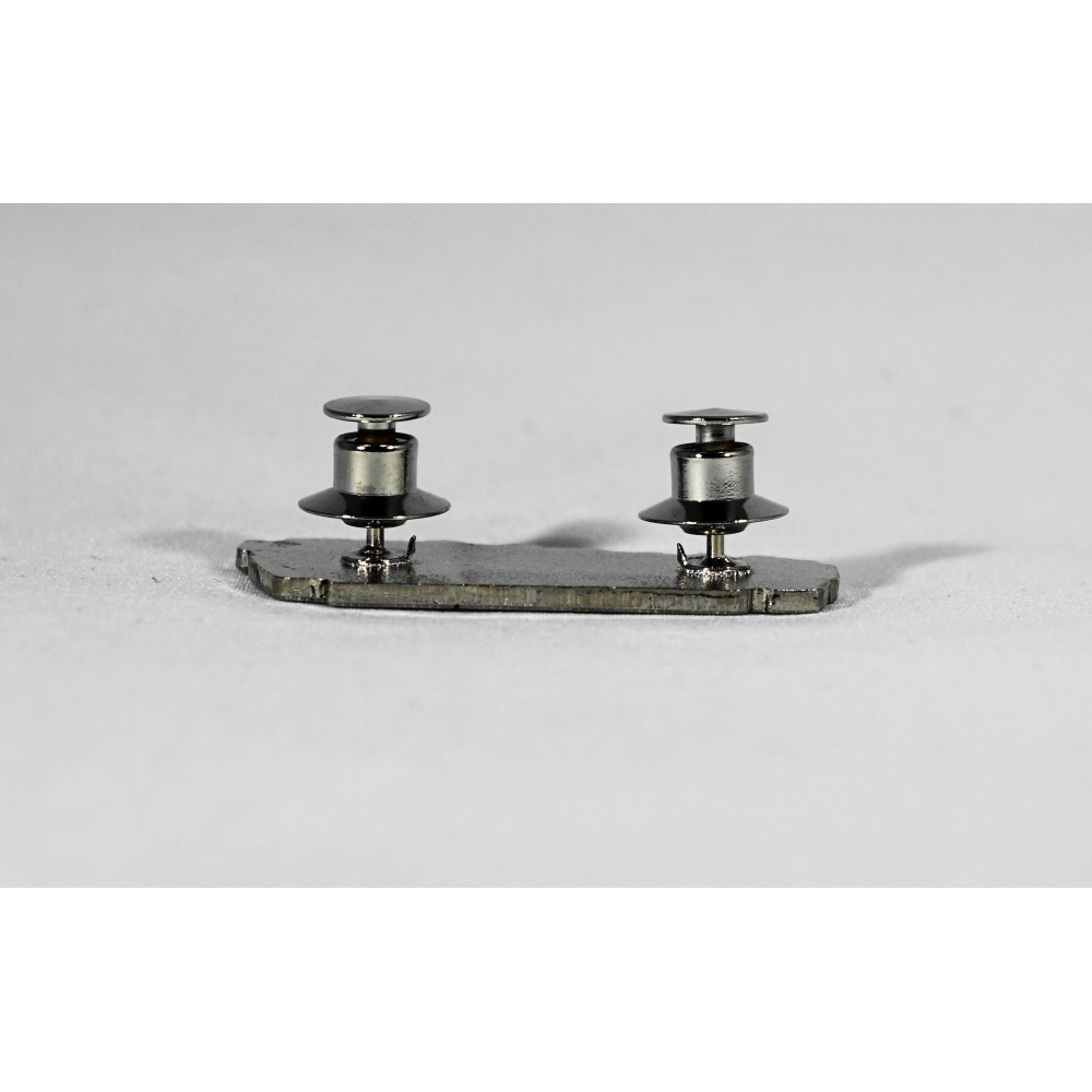 2-D hard enamel pin on a base of silvery metal. At the back the close consists of 2 butterfly clasps. The Traxx is 40mm long and 16,85mm high.