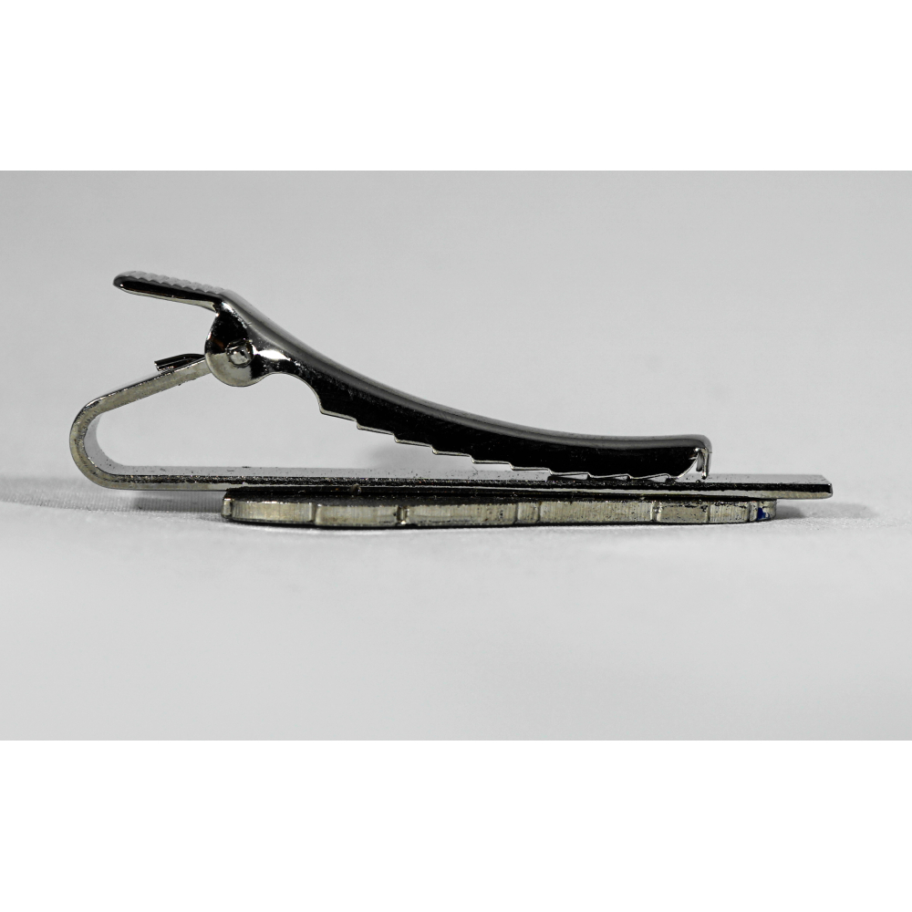 2-D hard emaille pin op een ondergrond van zilverkleurig metaal gezet op een krokodillebek dasspeld met opzetstukje. De dasspeld zelf is 55mm lang, de Sgmm is 40mm lang en 17mm hoog.