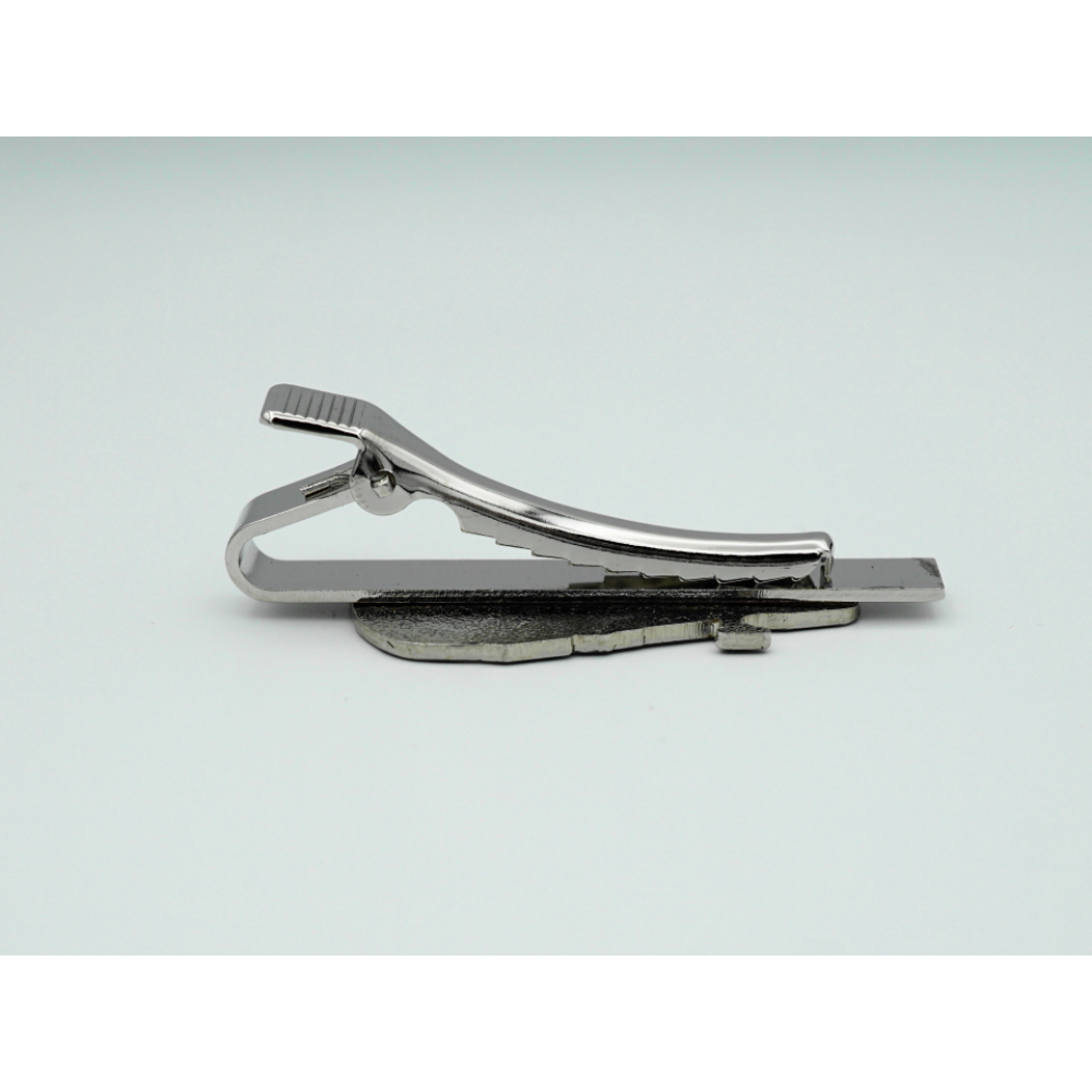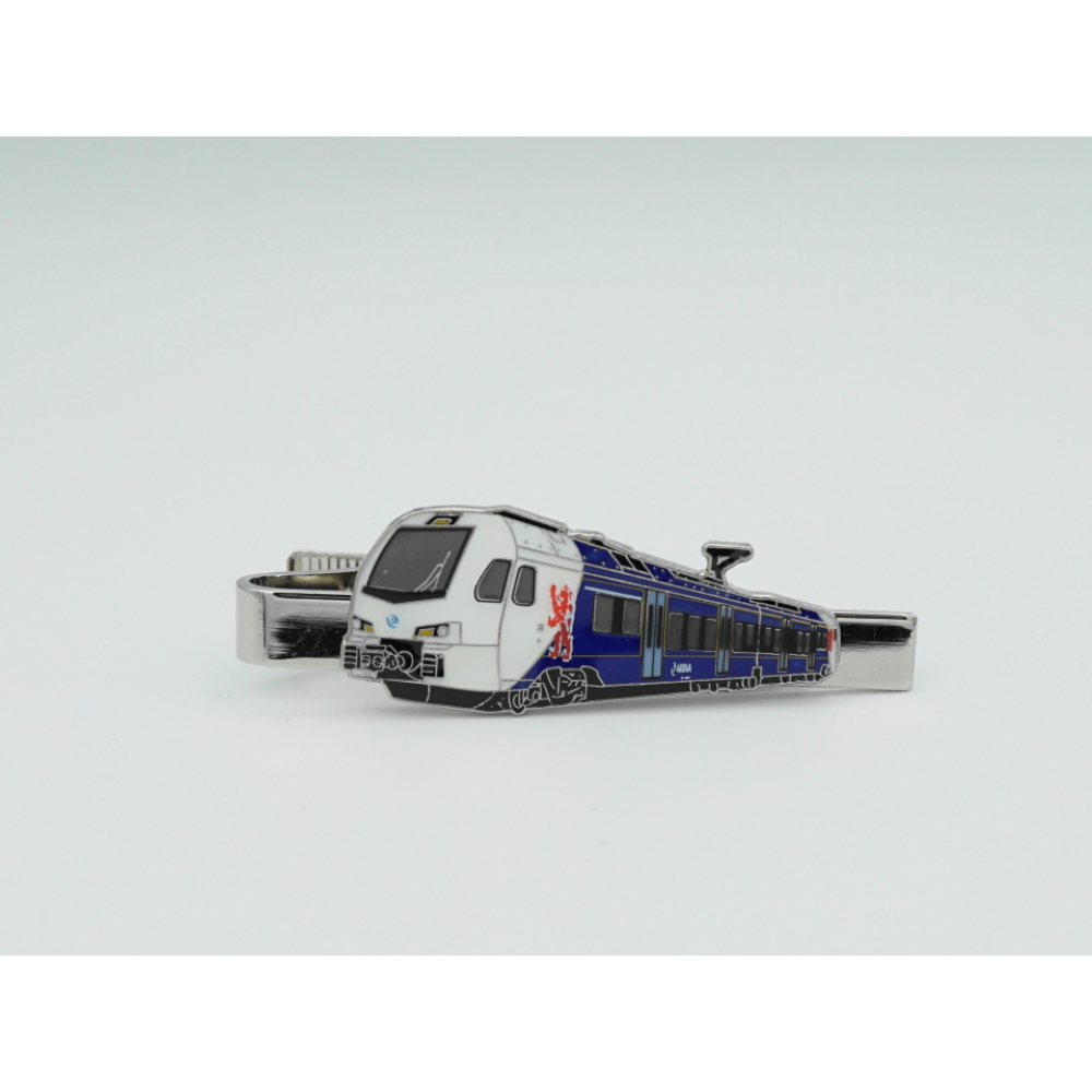 2-D hard emaille pin op een ondergrond van zilverkleurig metaal gezet op een krokodillebek dasspeld. De dasspeld zelf is 55mm lang, de Arriva Flirt Limburg is 40mm lang en 16,8mm hoog.