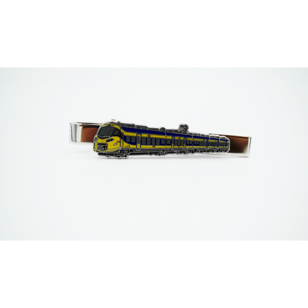 2-D hard emaille pin op een ondergrond van zilverkleurig metaal, gezet op een krokodillebek dasspeld. De dasspeld zelf is 57mm lang, de Icng is 40mm lang en 10,8 mm hoog.