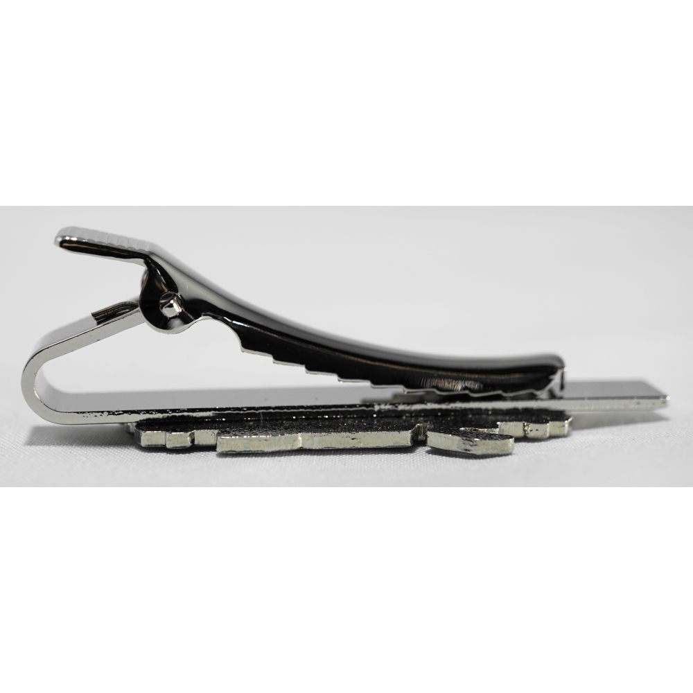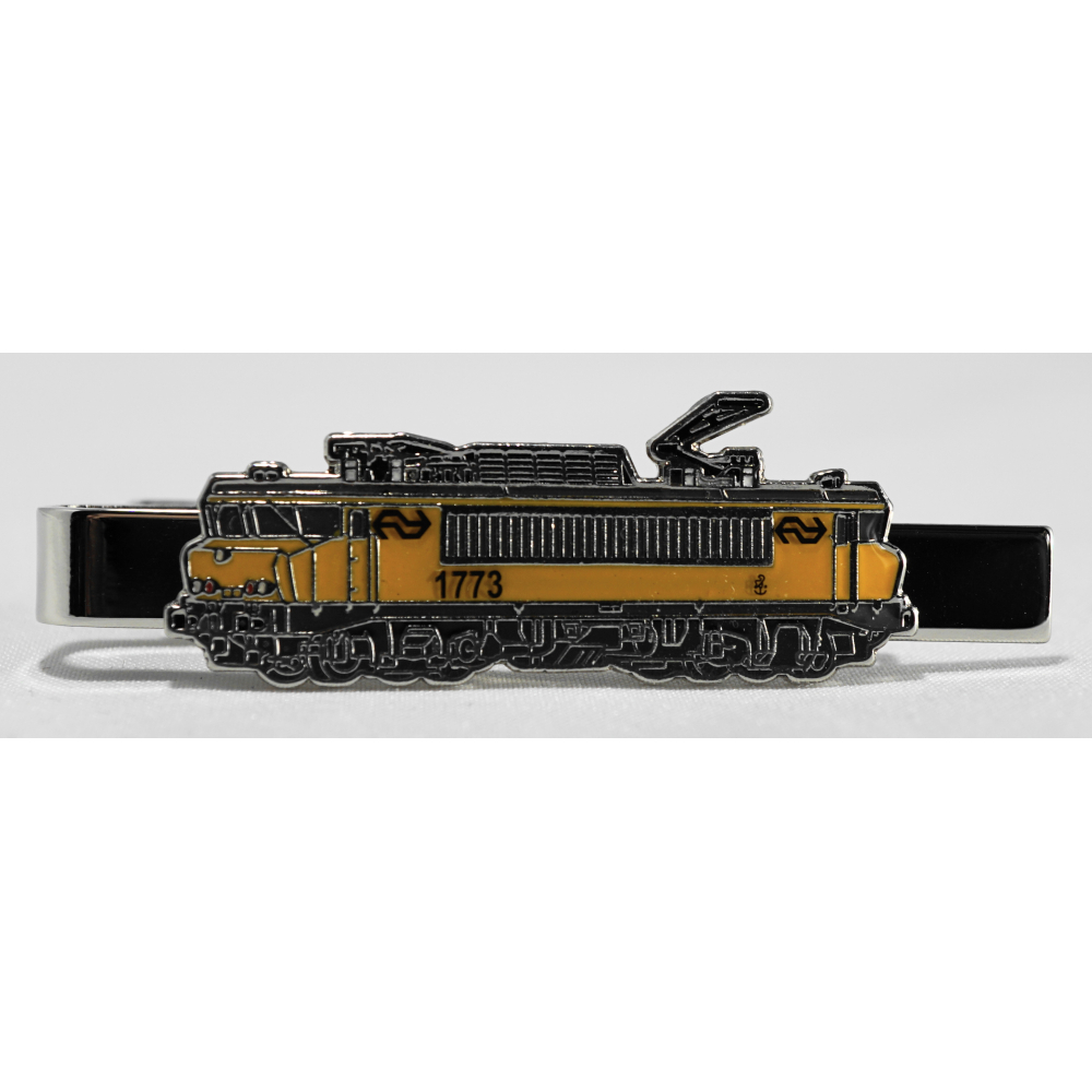 2-D hard emaille pin op een ondergrond van zilverkleurig metaal gezet op een krokodillebek dasspeld. De dasspeld zelf is 55mm lang, de NS E-loc 1700 is 40mm lang en 15,4mm hoog.